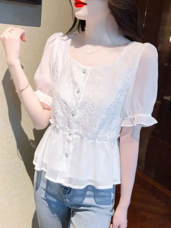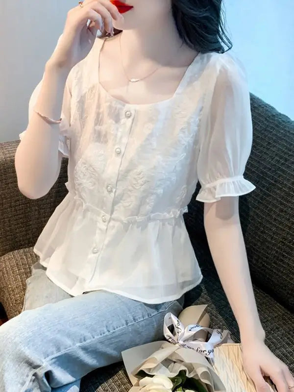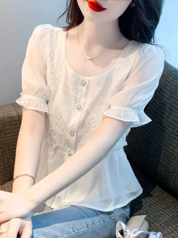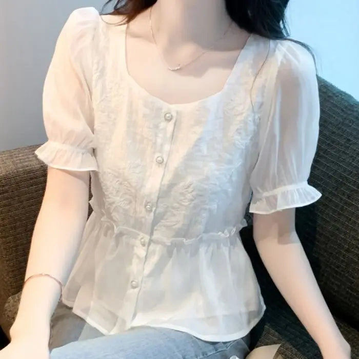 Kamilla | Dame Sommerbluse Med Flæseærmer, Peplum Snit Og Knaplukning
